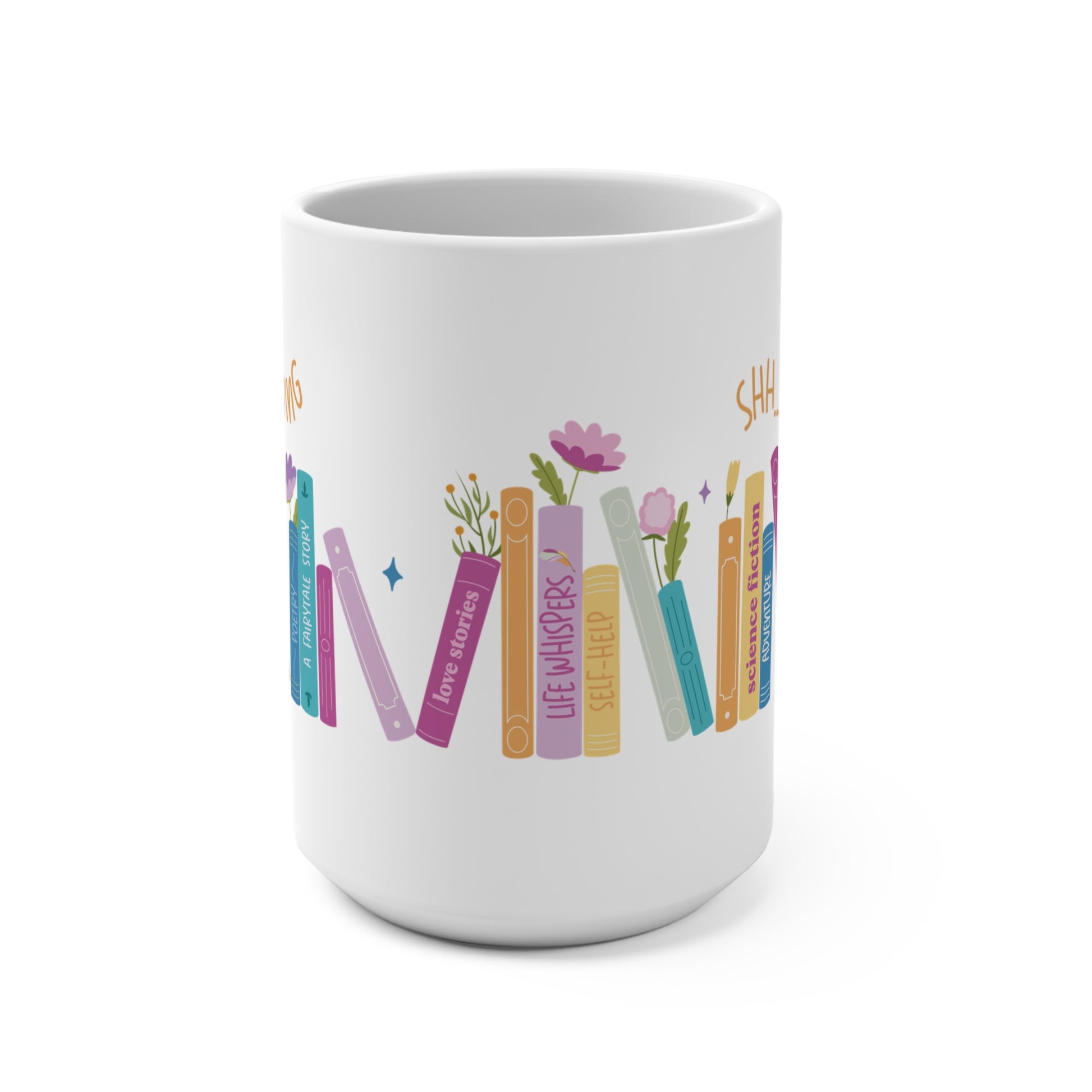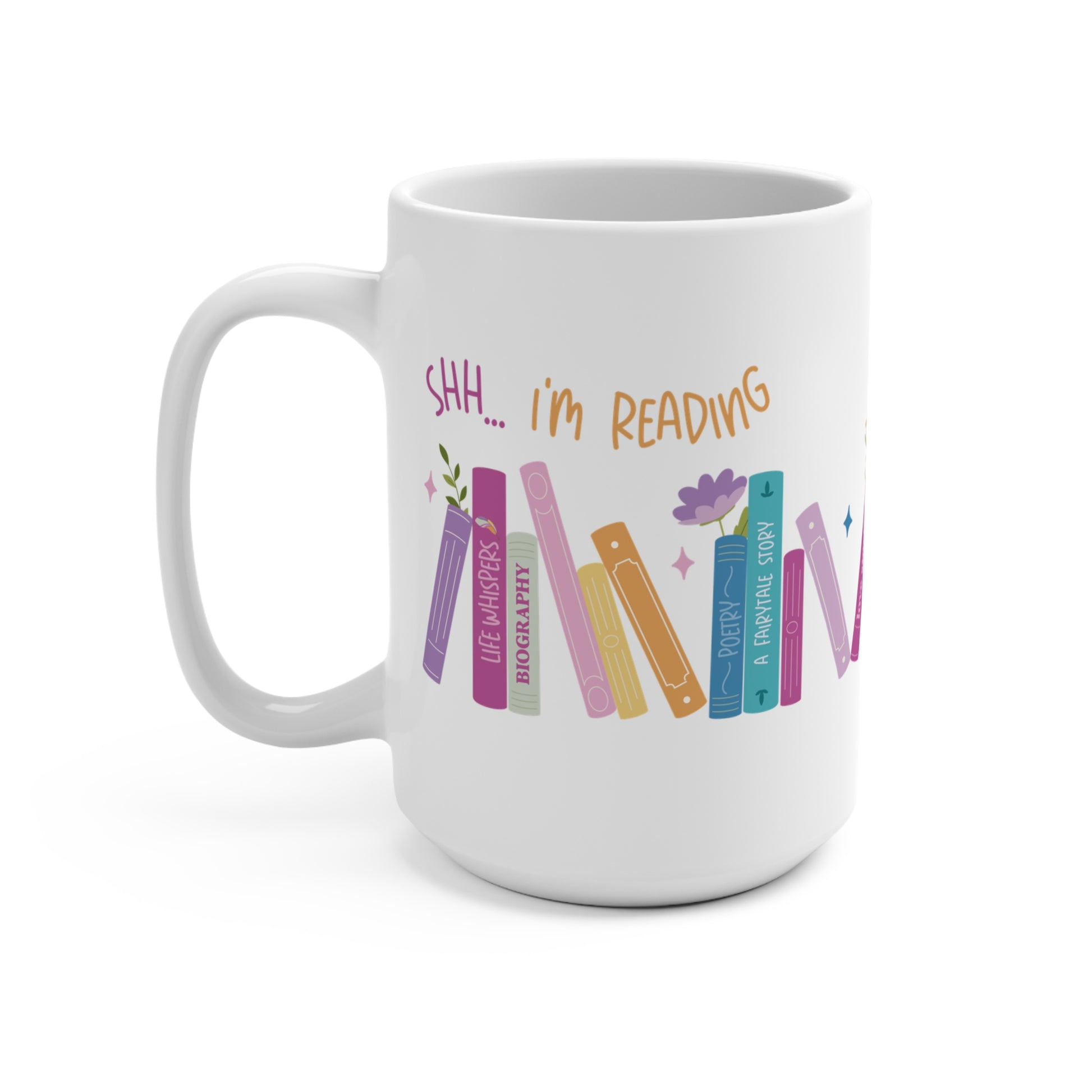 "Never run out of coffee with our 'Shh... I'm Booked' mug! This spacious 15oz ceramic mug is built to last, with high-quality sublimation printing that makes it a perfect gift for coffee and tea enthusiasts who are always ready for a refill. Ideal for those long reading sessions and cozy moments!"